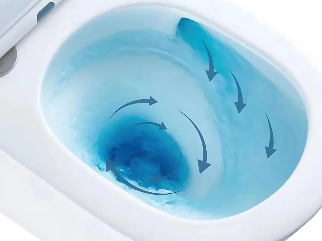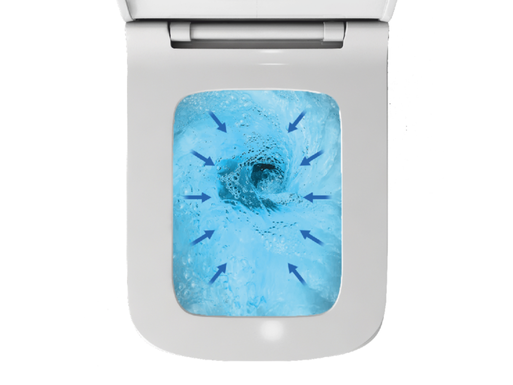 Hệ thống xả xoáy hoạt động bằng cách đưa nước ra từ nhiều điểm trên thành bồn cầu, tạo thành dòng xoáy mạnh bao phủ toàn bộ bề mặt trước khi thoát xuống dưới.