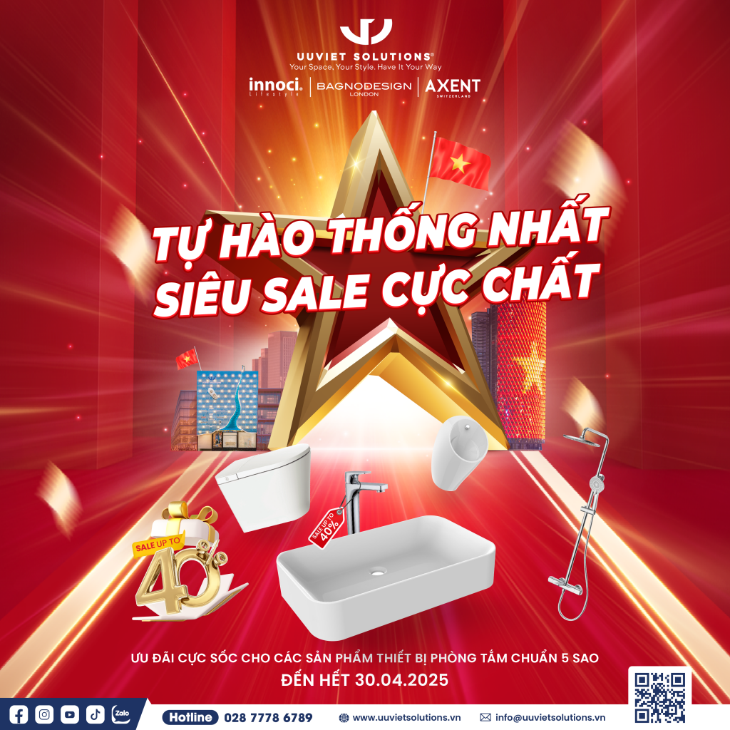 Tưng bừng trong không khí hào hùng của dân tộc, chào mừng 50 năm giải phóng hoàn toàn Miền Nam thống nhất đất nước (30/4/1975 - 30/04/2025), Uuviet Solutions bung vô vàng deal hấp dẫn, cùng khách hàng kiến tạo phòng tắm chuẩn Âu đỉnh cao với mức siêu sale lên đến 40%.